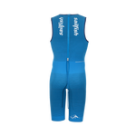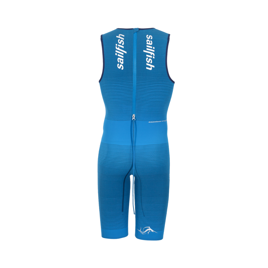 Highly water-repellent woven material for superior glide. Targeted compression zones optimize blood flow. Seamless construction reduces drag. Super-soft grip tape prevents chafing. Inverse back zipper for quick transitions
