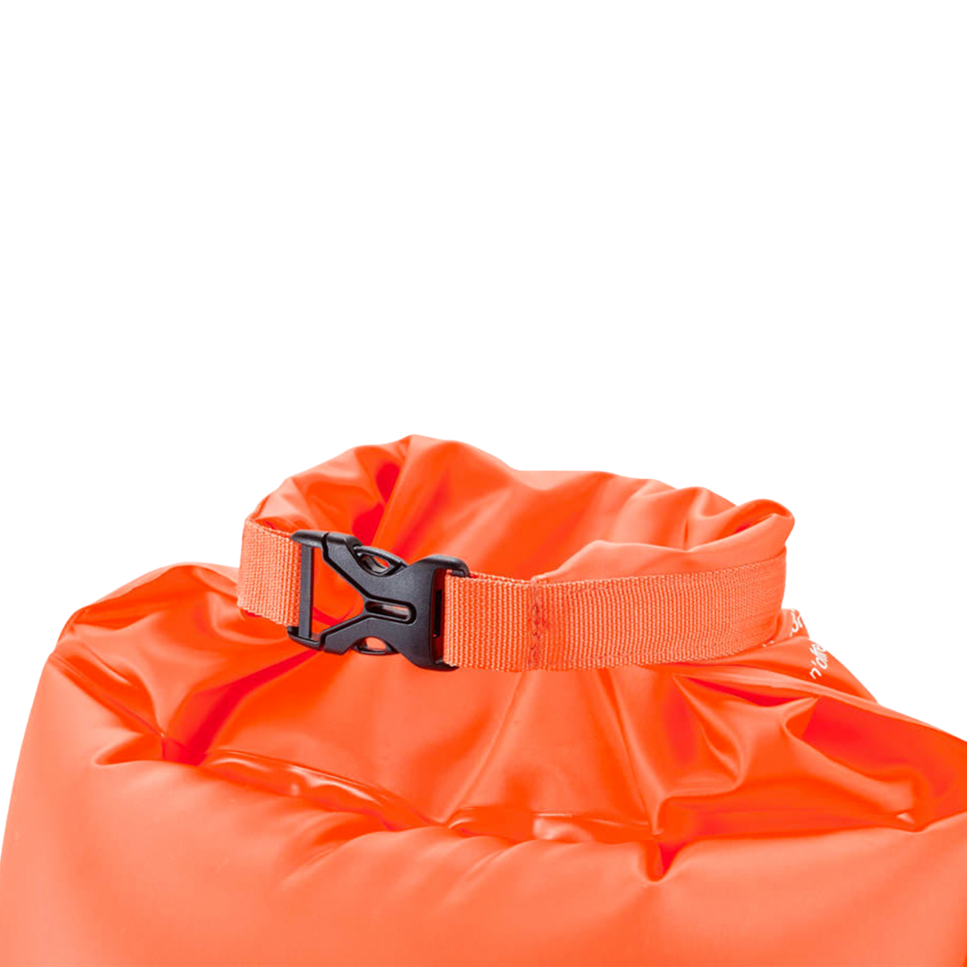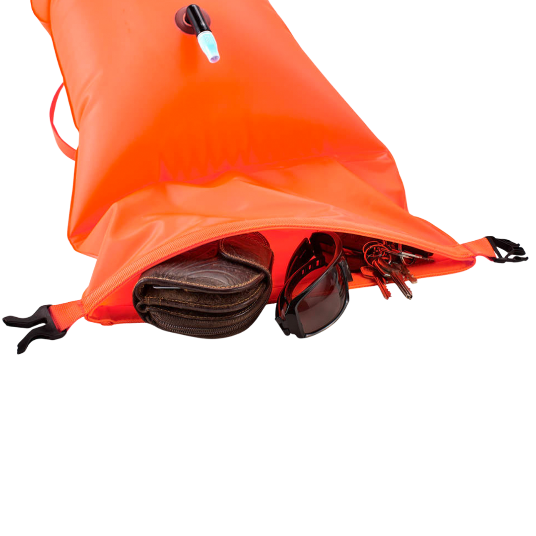The inflatable buoy provides high visibility for open water swimmers and offers a waterproof pocket inside, suitable for keys and smaller items (no electronic devices). It is attached to the swimmer with a waist belt with no negative impact on swimming performance, even if it is dragged behind. The simple rotary valve makes it easy to inflate and deflate. If necessary, the buoy can also be used as a buoyancy aid.